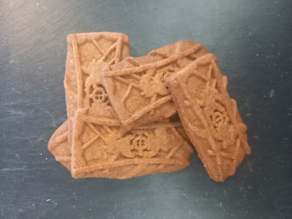Ingrédients : Farine de petit épeautre T70*, sucre de canne *, huile de colza*, farine de petit epeautre T110*, beurre*, miel*, malt d’orge*, poudre à lever : bicarbonate de sodium, cannelle*, sel marin